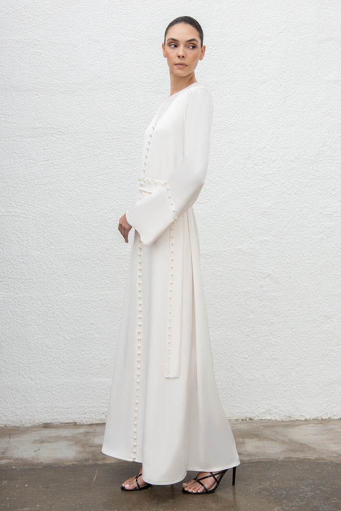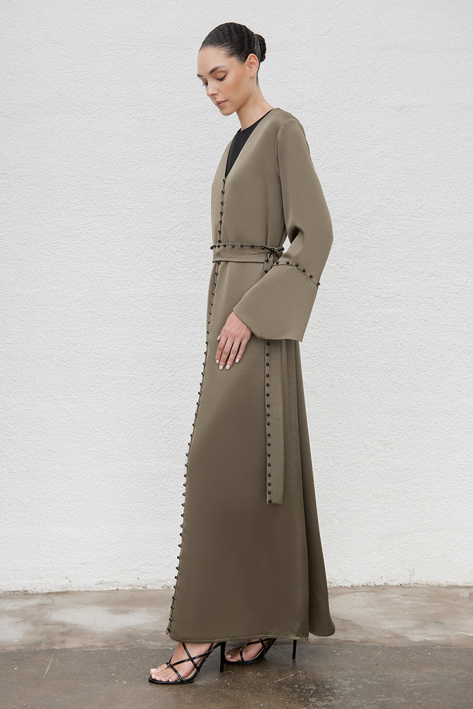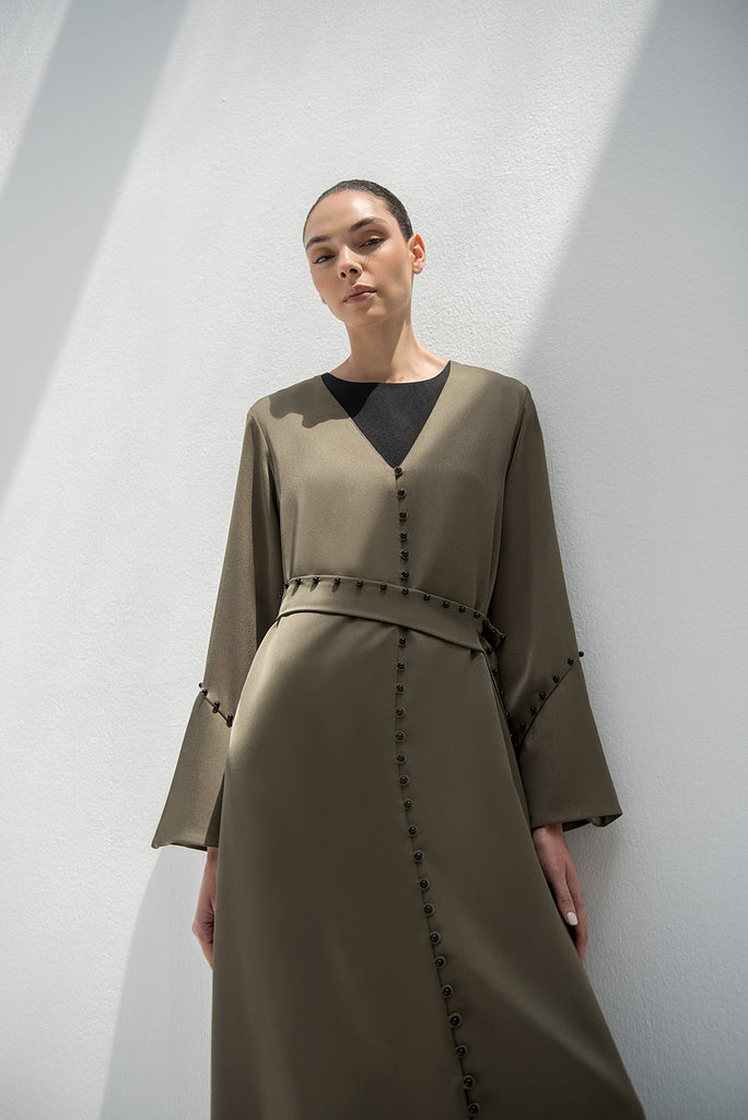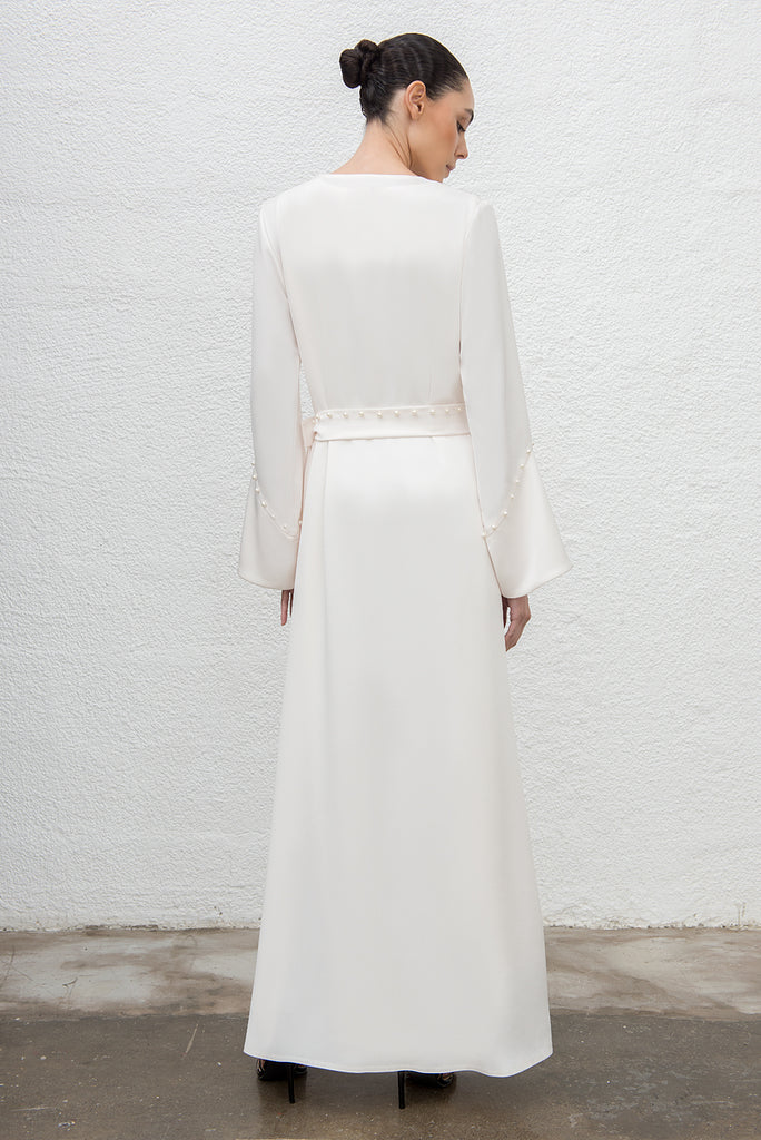 الوصف : عباية مزينة باللؤلؤ من الأمام والأصفاد، ومزينة بحزام متناسق مع اللؤلؤ.