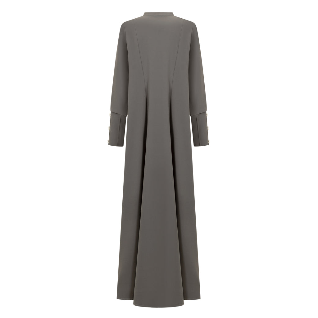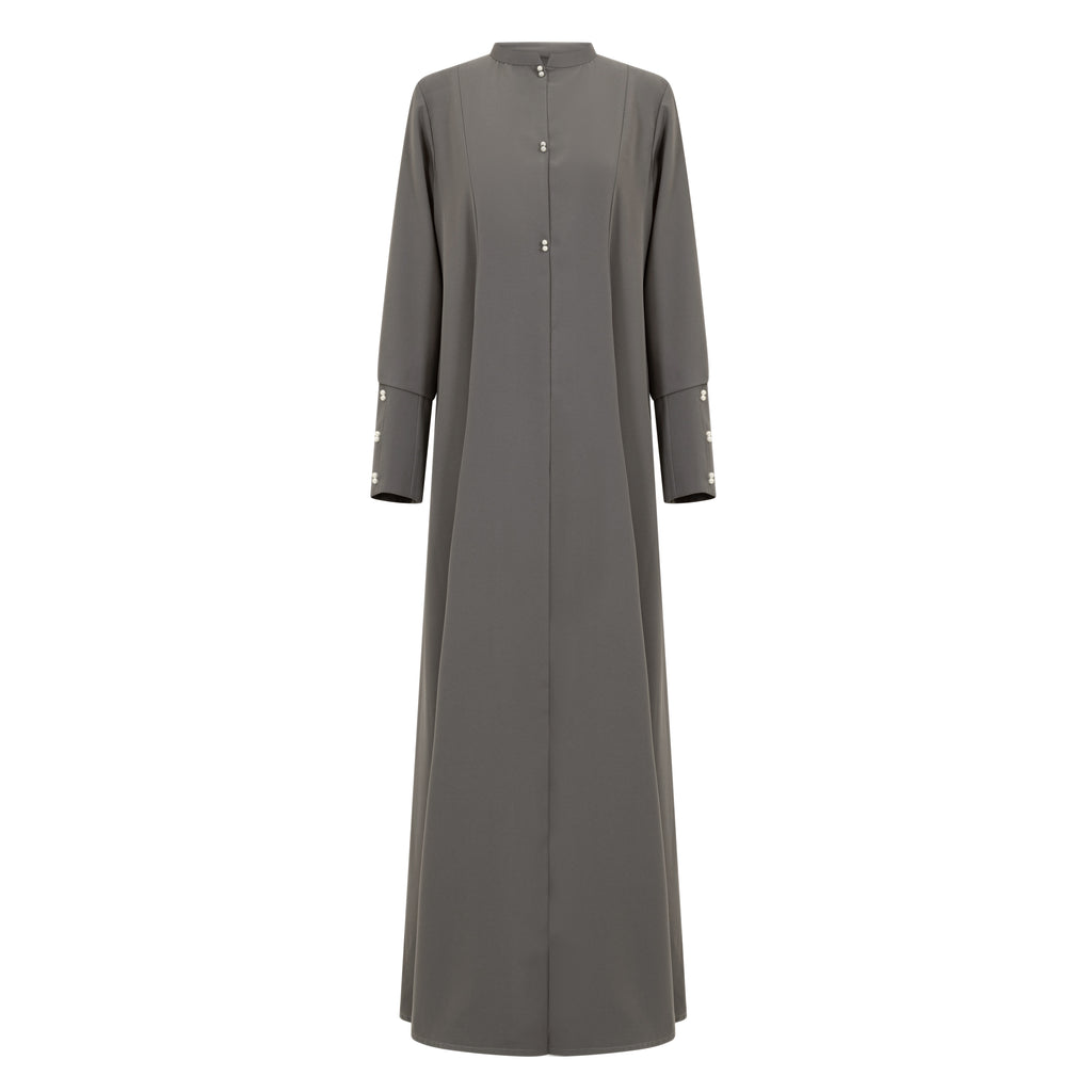 Description : Turtleneck abaya accented with pearls on the cuffs and along the chest panel.