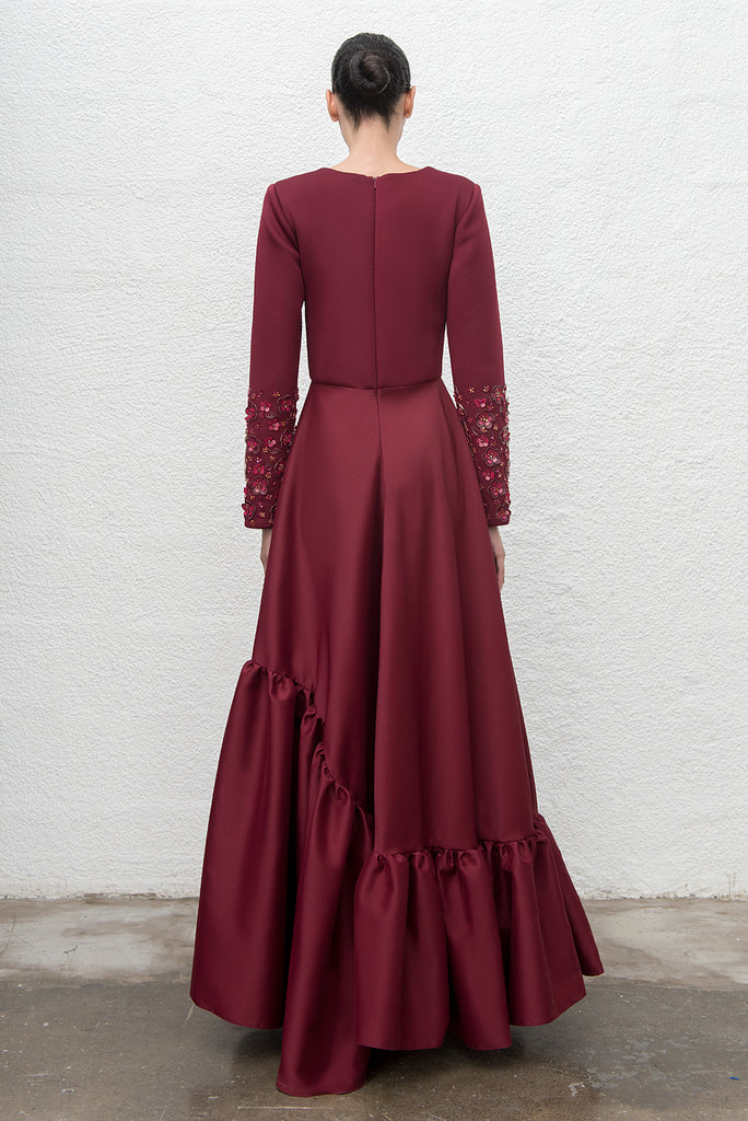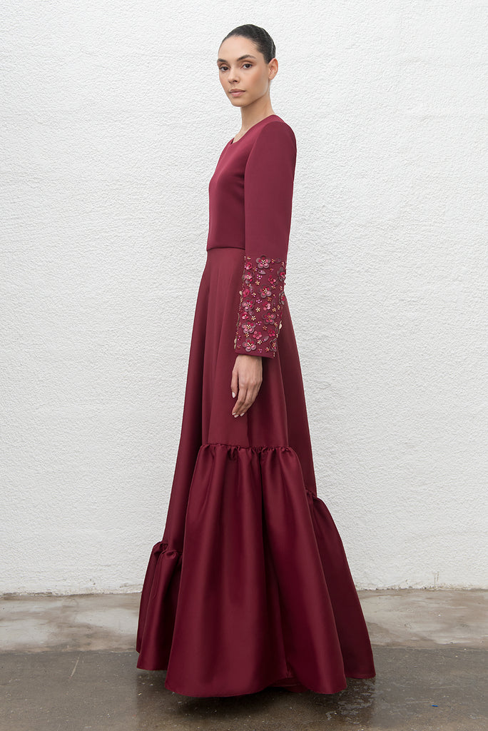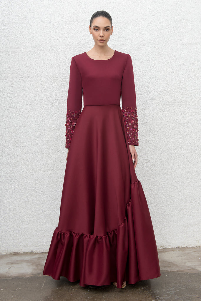 الوصف : فستان على شكل تنورة مزين بتطريز زهري وخرزي على الأكمام.