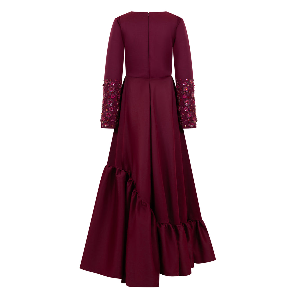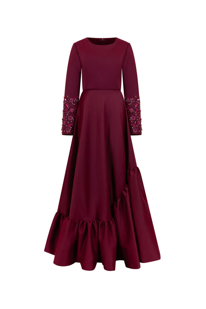 Description : Skirt-top style dress adorned with floral and bead embroidery on the cuffs.