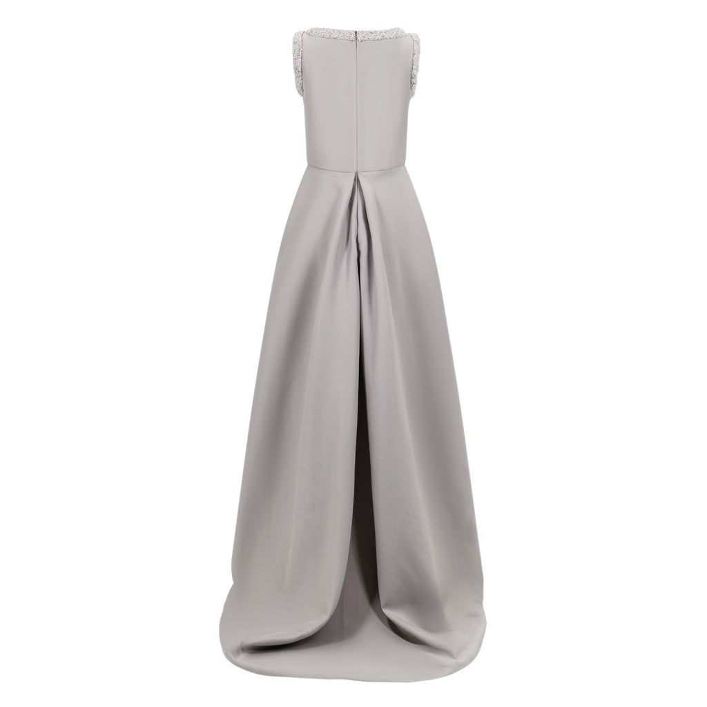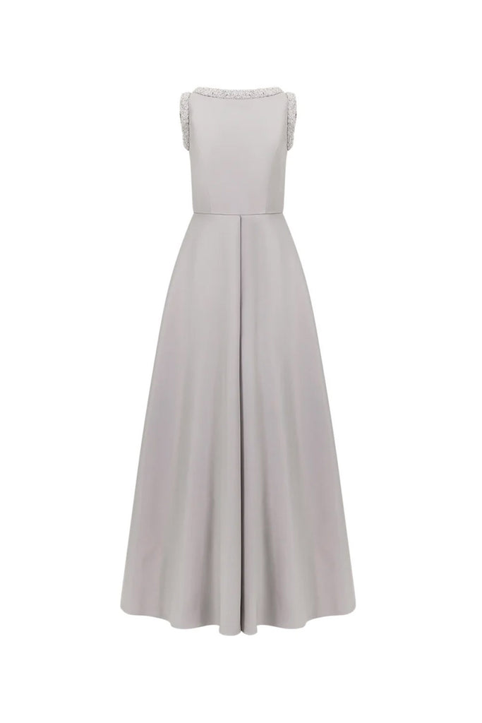 Description : Pleated evening dress adorned with elegant pearl and bead embroidery along the neckline and shoulders.