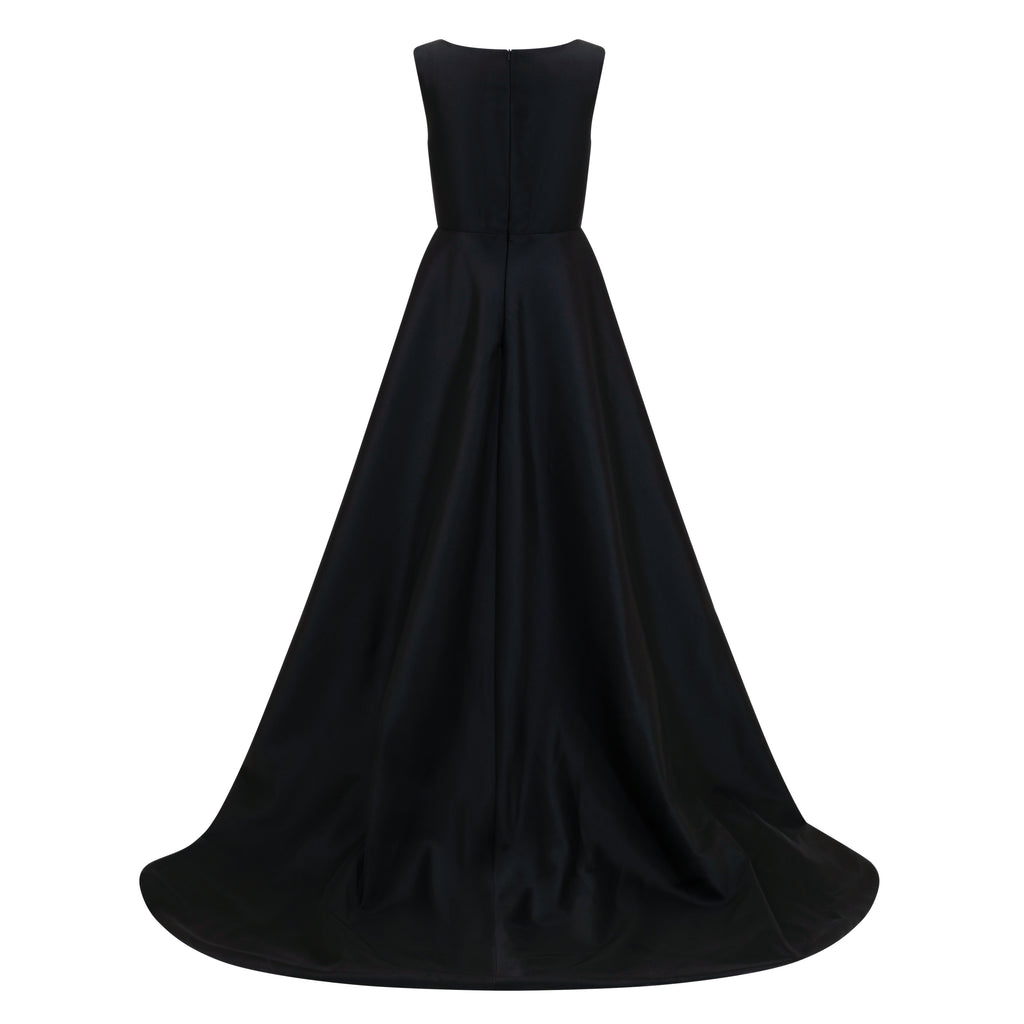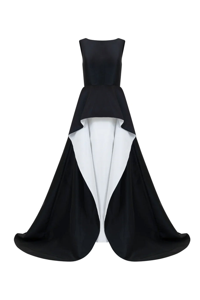 Description : Two-tone evening dress featuring layered open cut details at the front with a flowing trail.