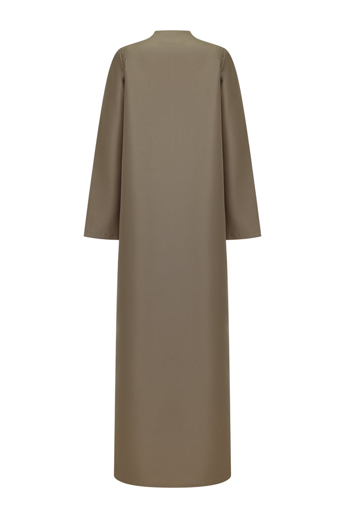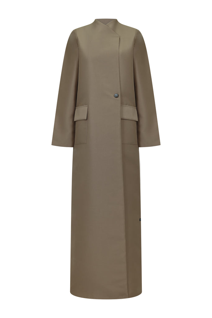 Description : Abaya with an asymmetric front, single-button detail and flap pocketsFabric composition : Bridal Satin