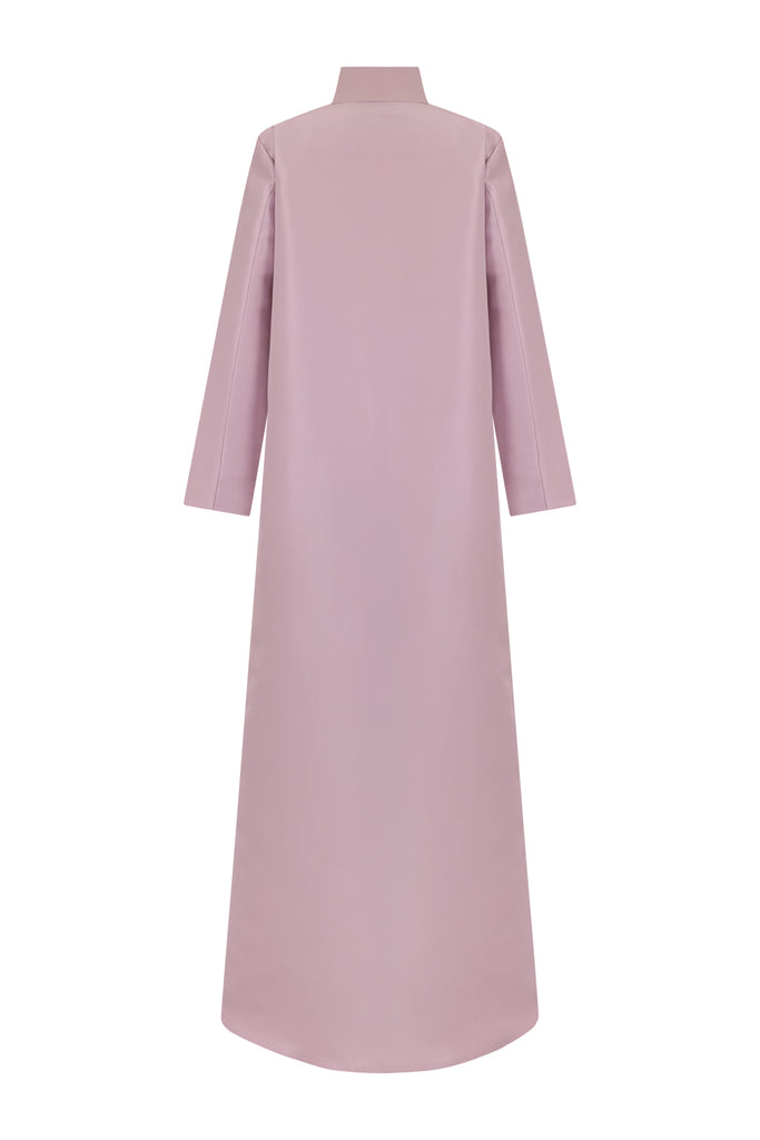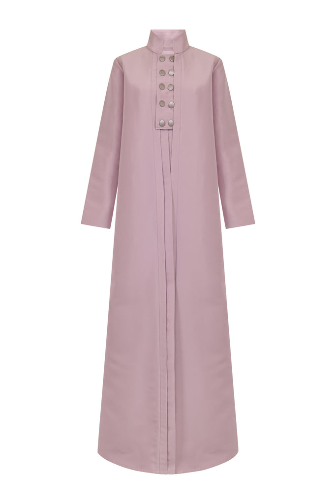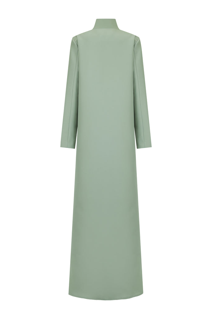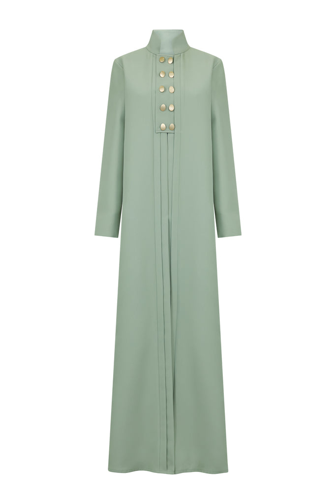Description : High-collared abaya with front gold button detailing and a sleek straight cut