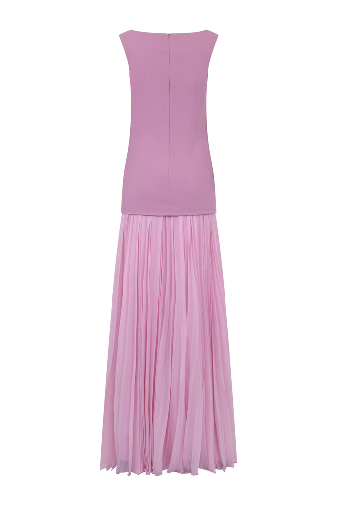 Description : Sleeveless boat Neck dress with pleated bottomFabric composition : Morrocon Crepe & Chiffon